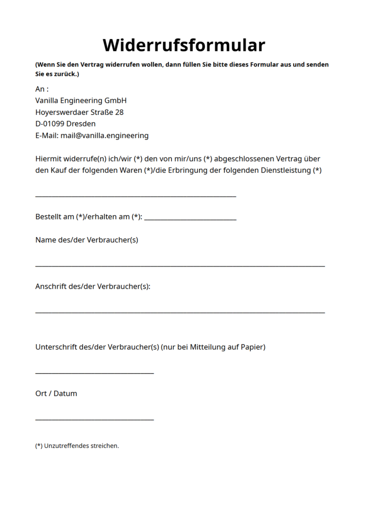 Um Ihr Widerrufsrecht auszuüben, müssen Sie uns (Vanilla Engineering GmbH, Hoyerswerdaer Str. 28, 01099 Dresden, Telefon: 0351 30973180, E-Mail: hallo@vanilla.parts) mittels einer eindeutigen Erklärung (z. B. ein mit der Post versandter Brief oder eine E-Mail) über Ihren Entschluss, diesen Vertrag zu widerrufen, informieren. Sie können dafür das beigefügte Muster-Widerrufsformular verwenden, das jedoch nicht vorgeschrieben ist.
